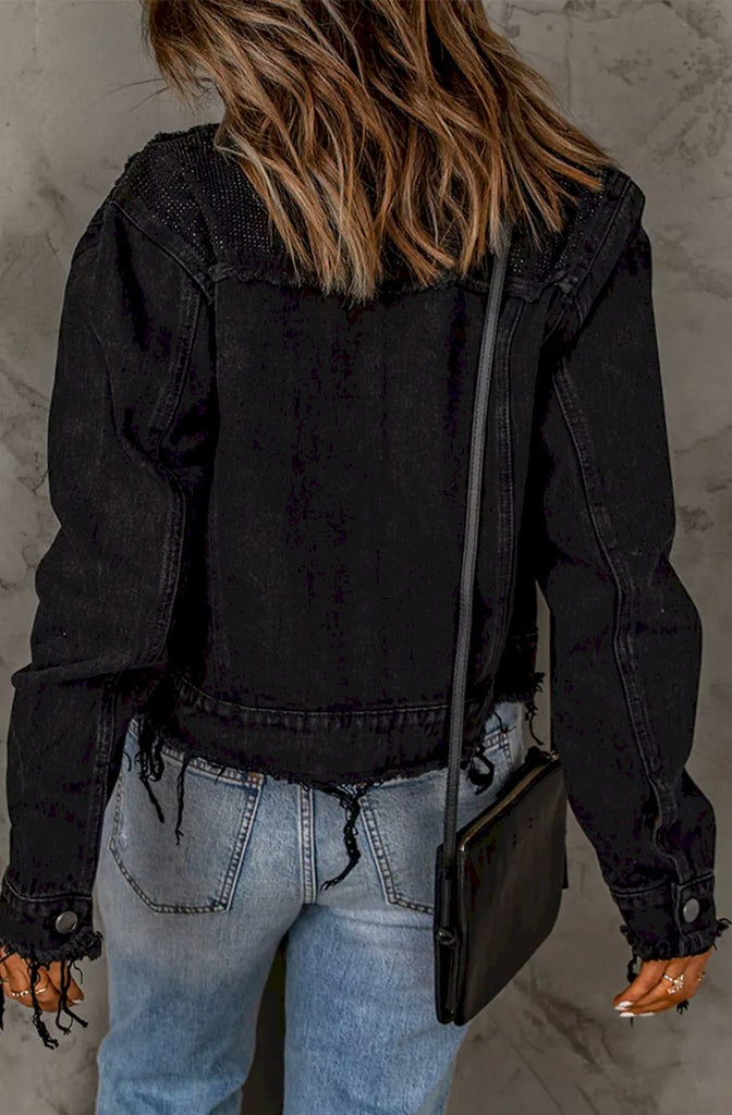 Black Frayed Trim Button Down Denim Jacket