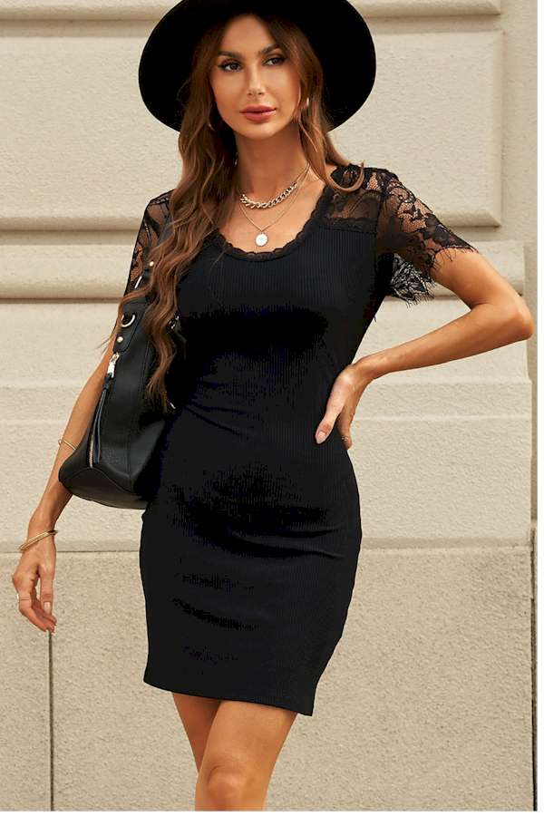 Black Lace Sleeve Ribbed Bodycon Mini Dress