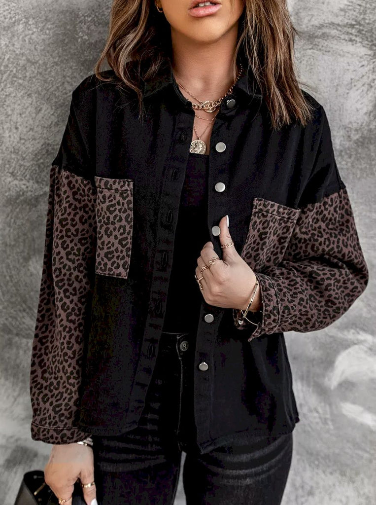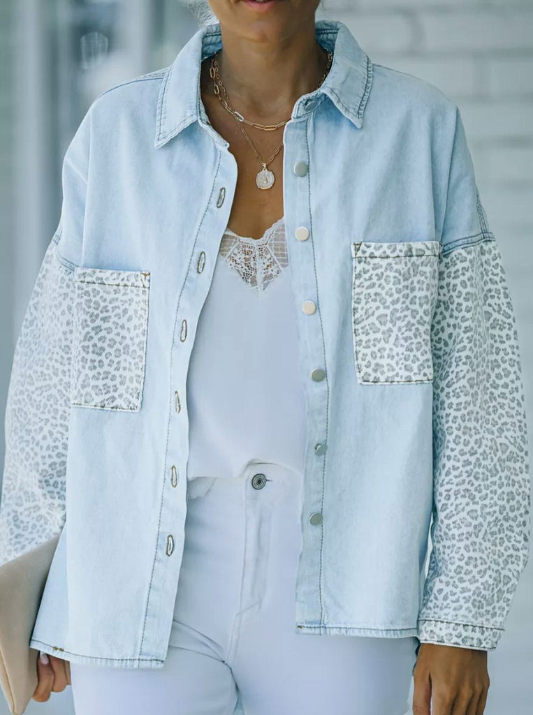 Our Contrast Leopard Denim Jacket is a light wash denim with contrast leopard sleeves