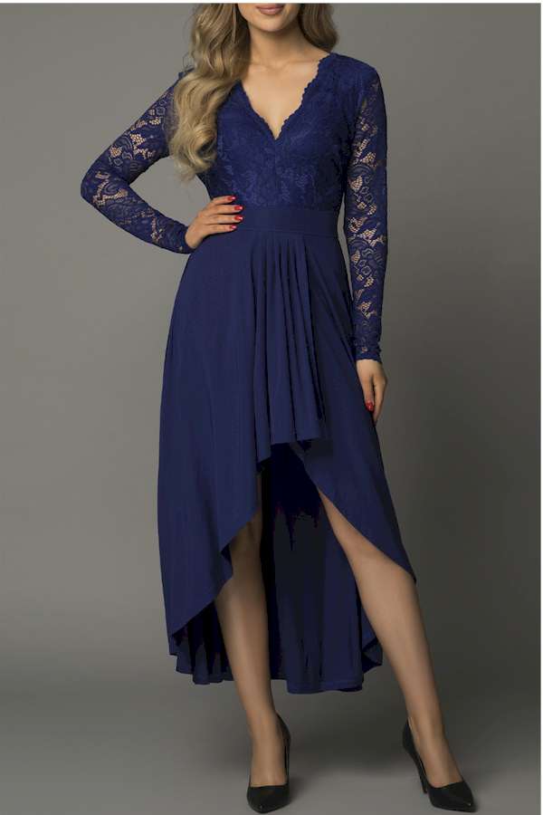 Chic and elegant, this v-neck long sleeve lace evening nress is the perfect choice for your upcoming special occasion. Featuring a deep V neckline, triangle slit and the high and low hem, it's designed to flatter and showcase your figure in a sophisticated way. With its classic and timeless look, you can be sure that you will make a great impression.