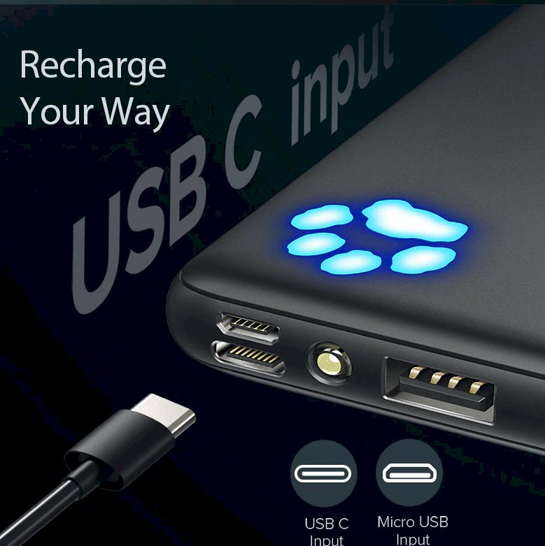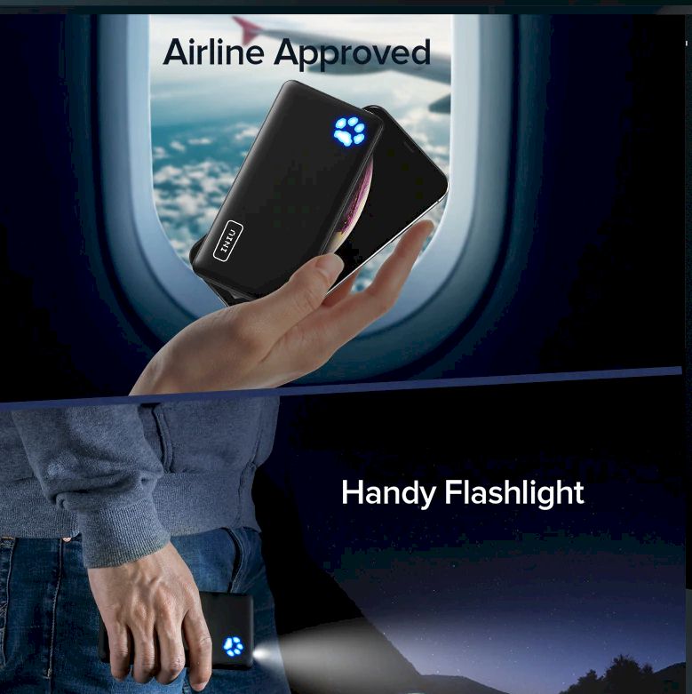 The thinnest 10000mAH charger available. It takes up very little space.  Dual High Speed Outputs... Airline Approves and a handy flash light.  Keep you phone, tablet and laptop energized and at the ready.