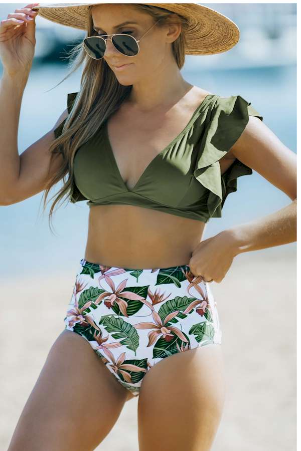 •Bikini set includes ruffled top and Ins style tropical print high-waist bottoms.