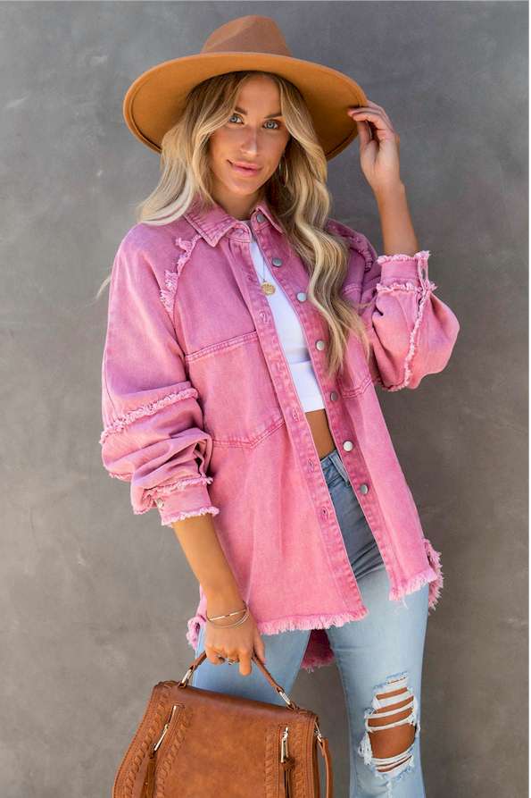 - Look super cool in the Frayed Hemline Denim Shacket that features front button closures.